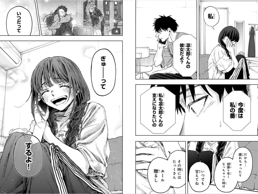 凛太郎と薫子が各々成長していくのと同時に、二人の恋人としての関係性も寄り添いあうものから、支え合う関係に変わってきている、そんな感じが伝わってくる最高のシーンが描かれています。